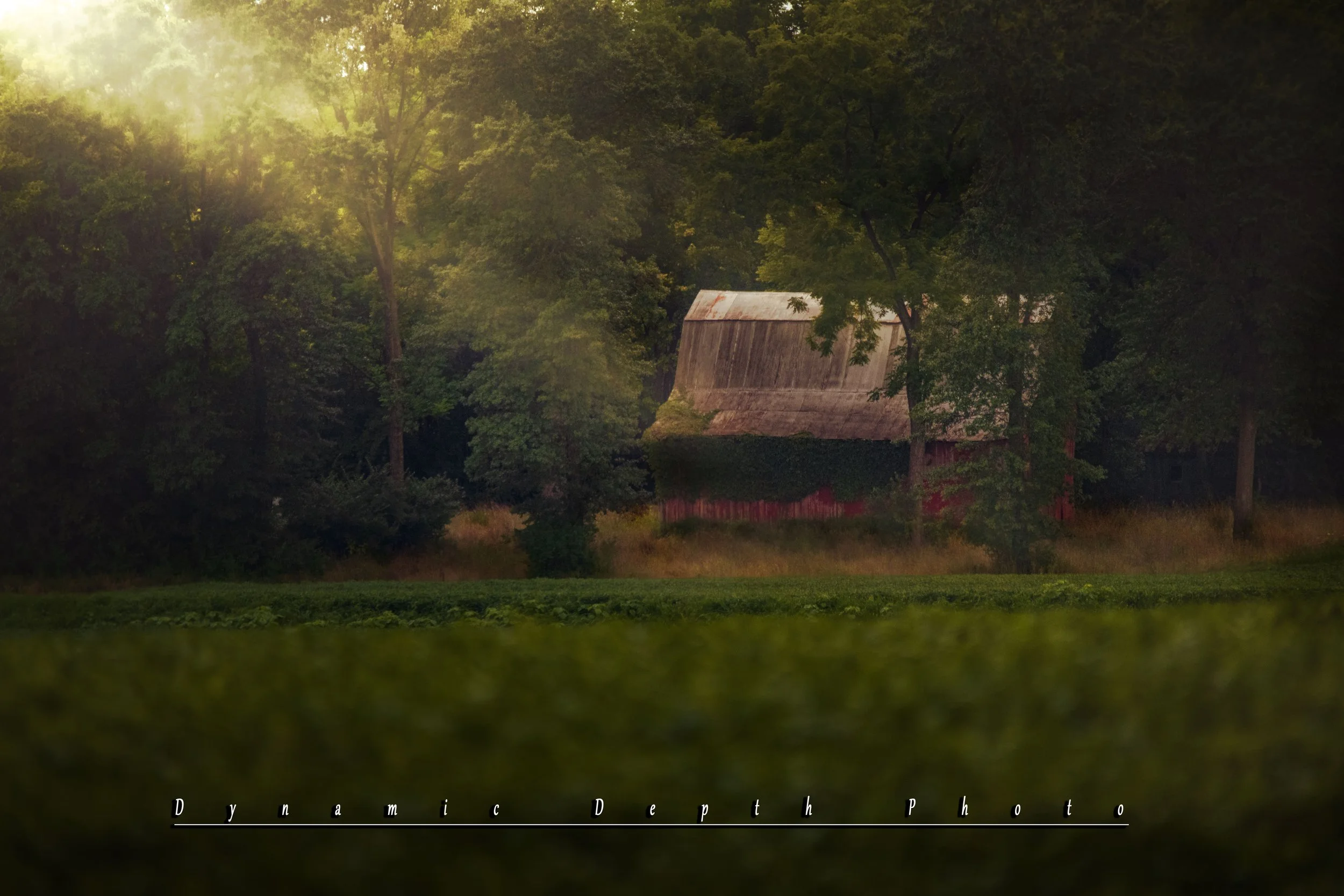 A black-and-white photo of a barn with leafless trees in front of it, seen in foggy weather. View fullsize